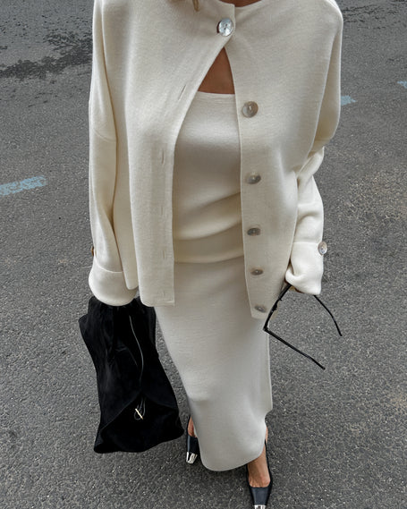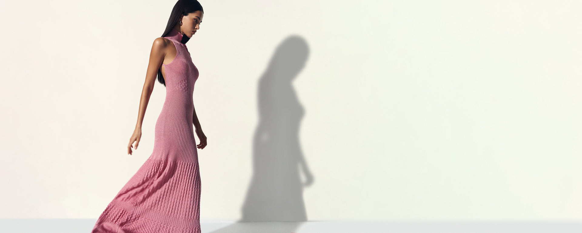 This dress is crafted from a lightweight viscose knit, giving it a beautiful and delicate look. It features a deep V-neckline and an open back, all coming together to create a form-fitting silhouette